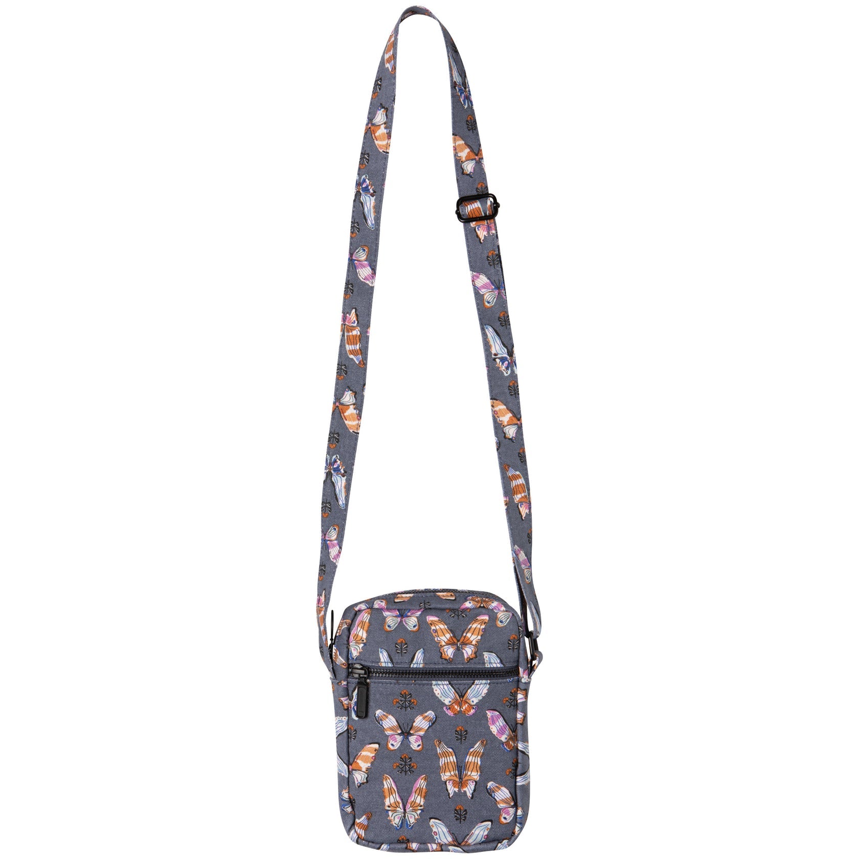 Designed for across town or across the world, the ever-popular crossbody bag gets an artful upgrade. With an adjustable strap, cell phone pocket, inner card panel, and zippered inner pocket, this Aurora crossbody bag is the lightweight and hands-free solution for running errands, sightseeing, or taking a nature walk. Spring dawns and a sunrise of color graces the butterflies wings in the Aurora design.