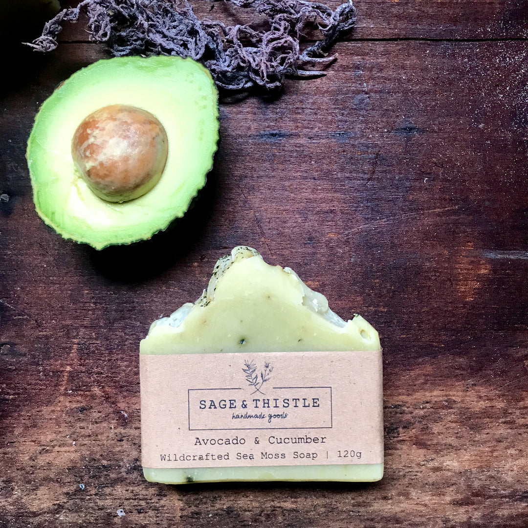 This ultra-luxe, vegan artisanal soap bar is crafted with natural ingredients to moisturize & nourish your skin while providing a deep yet gentle cleanse. Rich, organic avocado adds essential fats & vitamins to hydrate skin, cooling organic cucumber juice helps soothe inflammation, and wildcrafted Caribbean Sea Moss lends natural antimicrobial properties to not only cleanse pores, but soothe irritated skin. Subtly scented with a blend of Mint, Rosemary and Lemon essential oils, and the luxe blend of organic and Fair Trade plant oils & butters makes this soap a great choice for folks with sensitive skin, those prone to dermatitis and eczema. This soap is all-natural, vegan, and biodegradable, and suitable for everyday use as a hand, face and body bar.