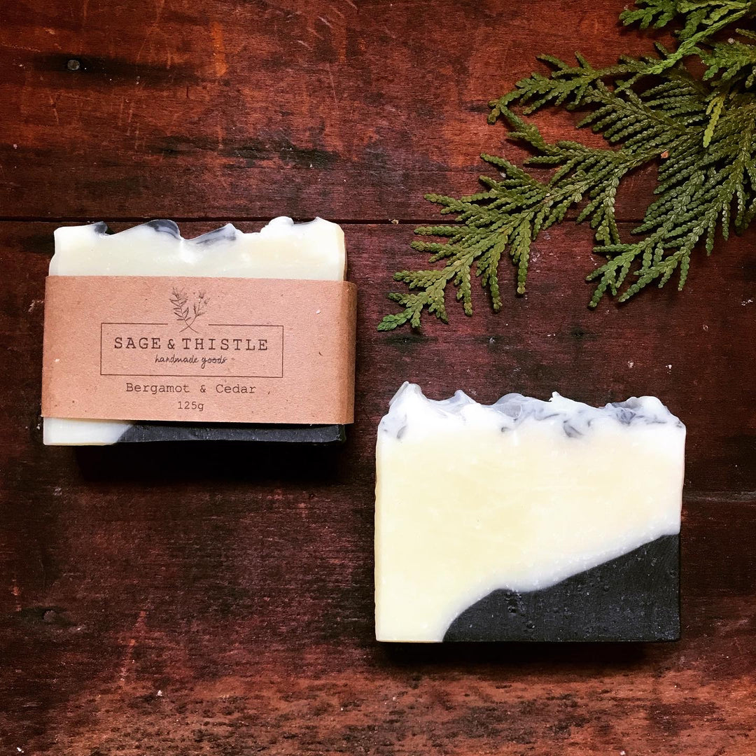 This highly moisturizing artisanal soap bar is made with organic plant oils & butters, and features Activated Charcoal for a gentle, detoxifying cleanse. Subtly scented with warm citrus & earthy Cedarwood essential oils, this vegan-friendly bar is appealing to all genders, and suitable for all skin types for everyday use as a hand, face and body bar.