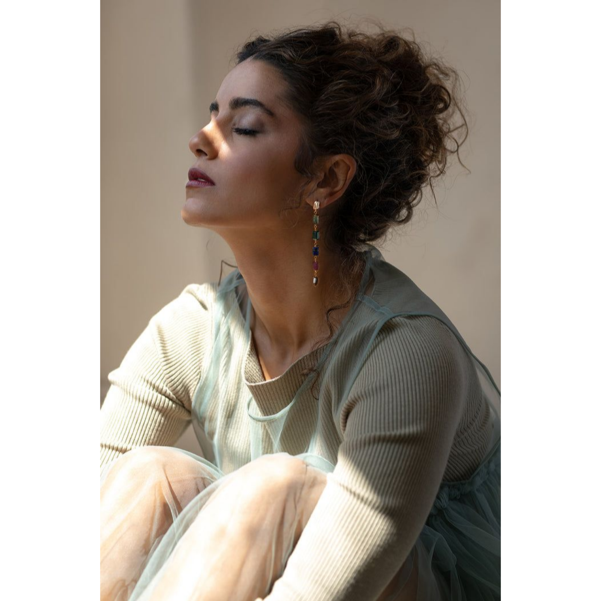 The Boreal Earrings are a luxurious statement piece, beautifully crafted with jewel tones to create a striking rainbow effect. Add a touch of elegance to any look, featuring Malachite, Lapis, Ruby Zoisite & Pyrite.