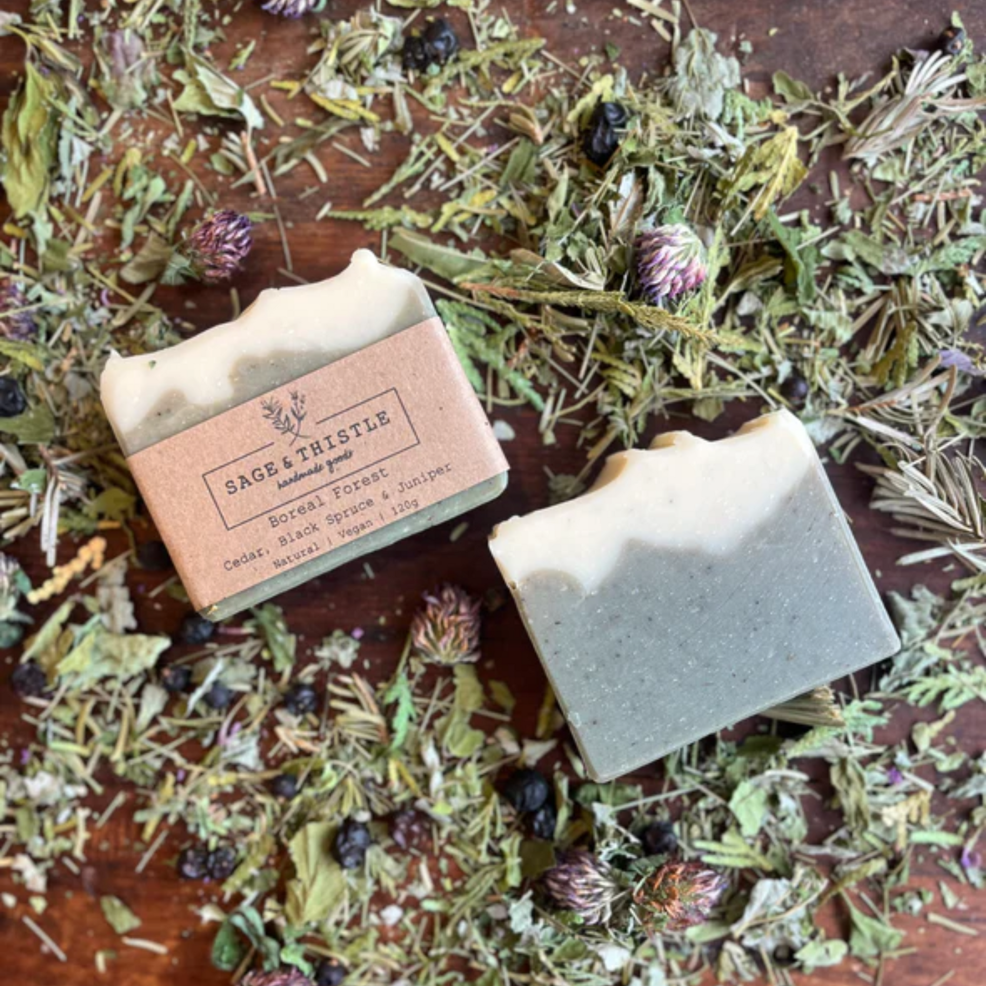 Inspired by the Boreal Shield Forest of Ontario & using responsibly foraged botanicals slowly infused into the oils that make up the base of this soap. Blend of woodsy & resinous essential oils and the rich natural pigments that give this bar a beautiful color. Each ingredient has been hand-picked to provide nourishment & a gentle yet deep cleanse.