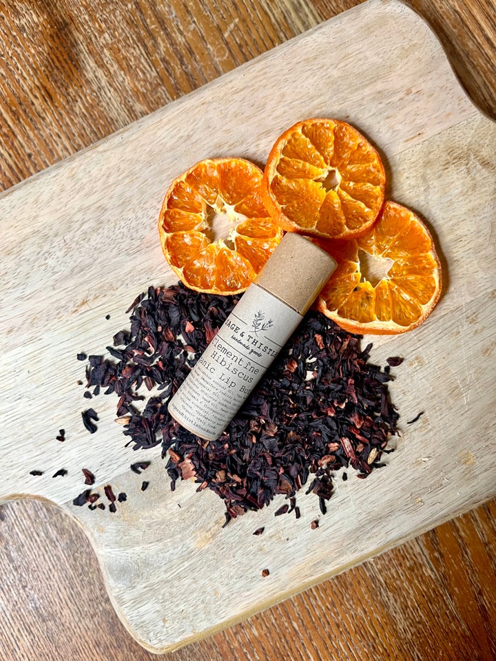 Ingredients: Non-GMO Canadian Sunflower (Helianthus annuus) Oil, *Raw Beeswax (Cera alba), *Mango (Mangifera indica) Butter, +Shea (Butyrospermum parkii) Seed Butter, *Jojoba (Simmondsia chinensis) Oil, *Virgin Rose Hip (Rosa Rubiginosa) Seed Oil, *Hibiscus (Hibiscus sabdariffa) Oil, *Vitamin E (Tocopherol) Oil, Sweet Orange (Citrus sinensis) Oil, Infused Botanicals: Clementine (Citrus clementina), *Hibiscus, responsibly foraged *Staghorn Sumac (Rhus typhina) berries, **Strawberry Leaf (Fragraria)