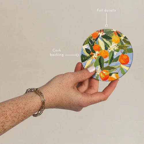 These coasters are created with up-cycled materials, an eco-friendly cork backing to protect your surfaces, and coated to be reused again and again.