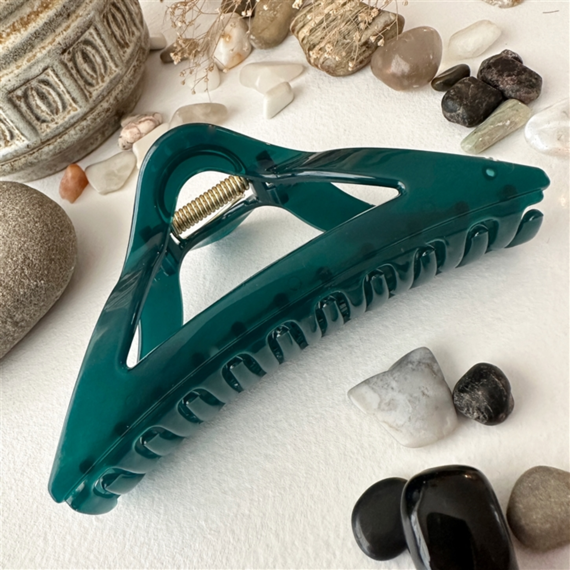 With a wide mouth and a row of extra teeth, this beautiful hair claw's bite is definitely bigger than its bark. We love the swooping shape and cut outs on this hair claw. The structure makes it a great piece for someone with thicker or longer hair.