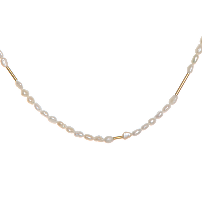 The Oso Necklace is now available in Blue Lace Agate, & Freshwater Pearl with recycled brass spacer tubes placed asymmetrically throughout.