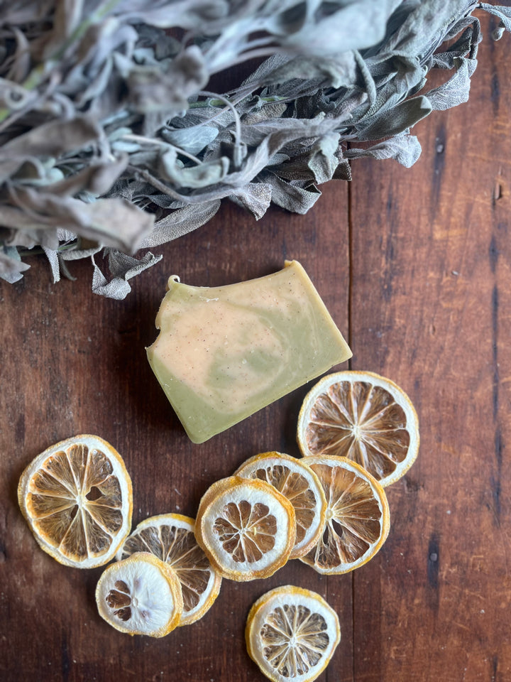 Made by a gardener for gardeners, this soap is the perfect balance of cleansing power, gentle exfoliation, and hydration - a must-have for anyone with their hands in the dirt this Spring and Summer! Made with a blend of plant-based oils and butters, this bar features organic Peruvian Sage from the Sage & Thistle Garden, wildcrafted Caribbean sea moss for its moisturizing and hydrating effects, apricot kernel meal for gentle exfoliation, and a blend of clays and organic Spirulina for detoxification and natural color. Scented with a gentle blend of citrus, Litsea, and Sage, one of our favorite plant allies for cleansing and relaxation, this long-lasting vegan bar is great for everyday use as a hand, body, or facial bar.