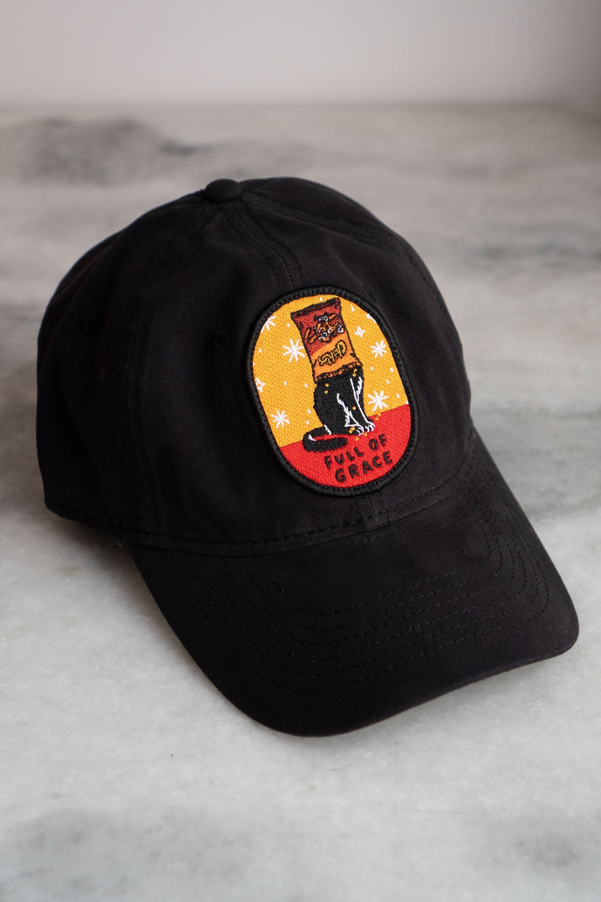 Embroidered patch sewn onto a 6 panel unstructured baseball hat (AKA "dad hat"). Adjustable strap back with metal clasp.