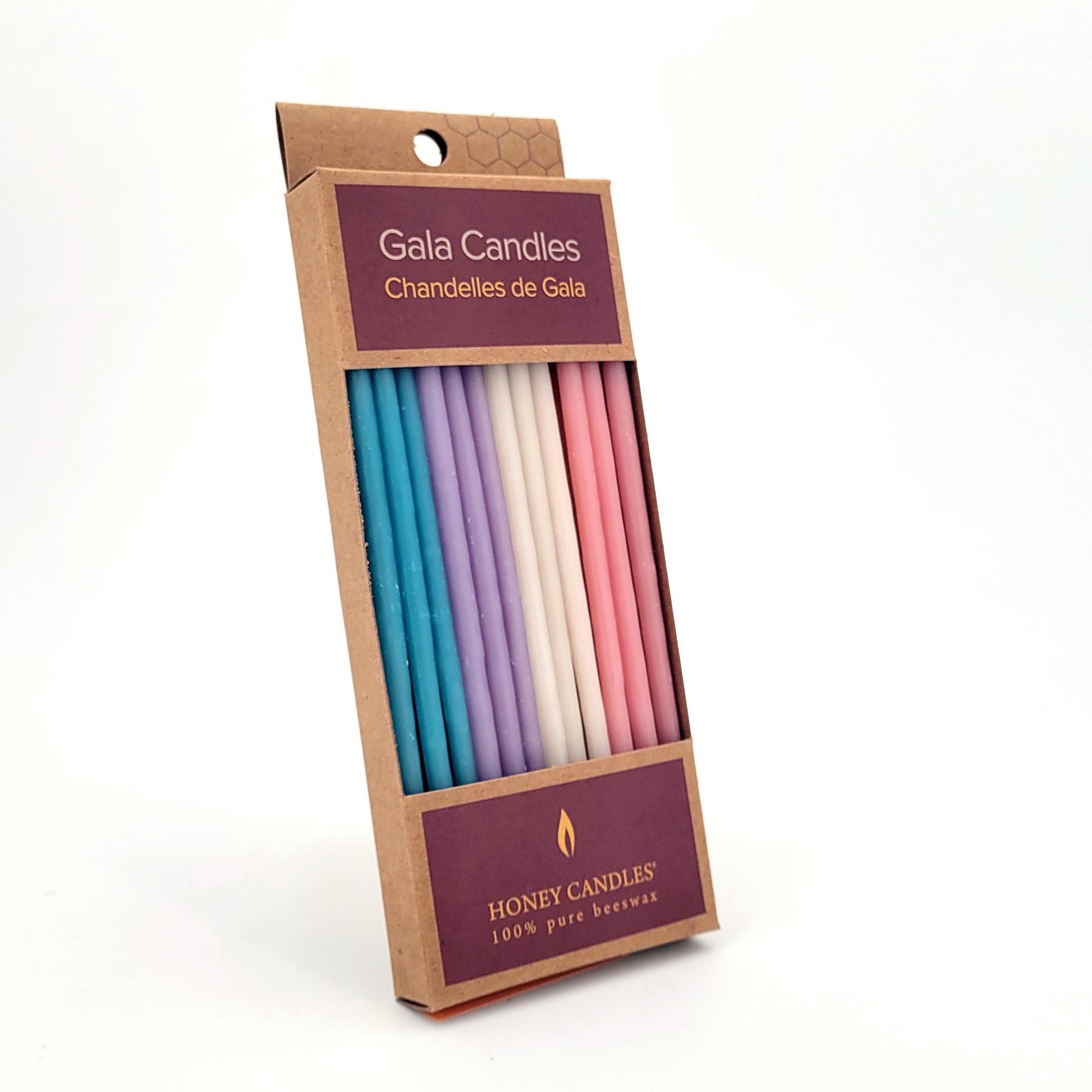 Made by hand in Kaslo, British Colombia from 100% Canadian beeswax. At 6 inches tall, gala candles are longer than our regular birthday candles, making your cake a little extra festive. No added fragrances, just pure and natural beeswax scent, and colored with all environmentally-friendly dyes. Best of all, they're dripless, meaning no wax on your cake!