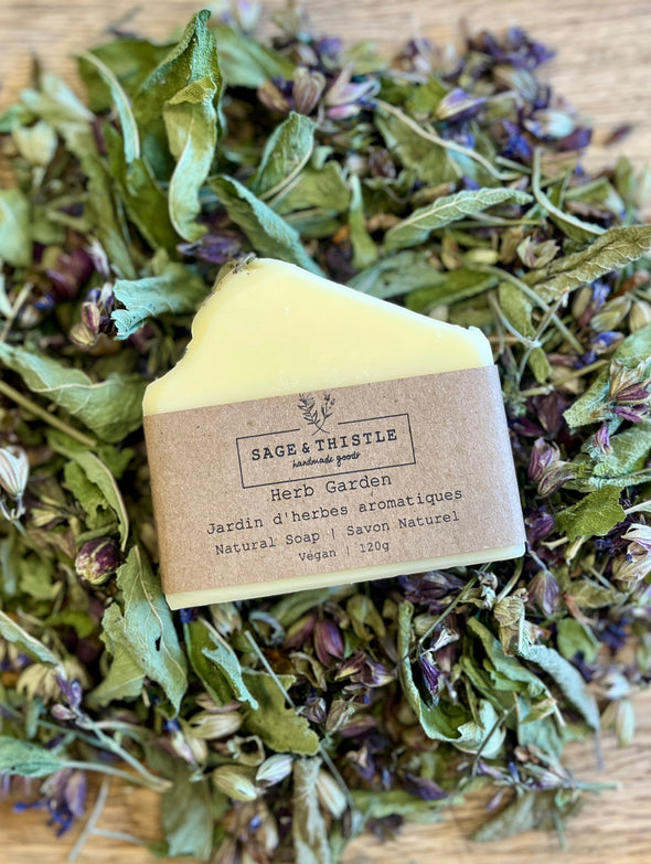 Welcome beautiful Spring & Summer days with this new beautiful, Herb Garden soap, infused with herbs grown in the organic Sage & Thistle garden in Toronto. This rich, plant butter-based bar is infused with organic Sage, Lavender, and Rosemary, and gives a gentle cleanse without drying skin. The beautiful botanicals in each bar are some of our favorites to grow & use, and we are so pleased to share them with you. This bar is the perfect gift for the gardener, plant-lover, and outdoorsperson in your life.