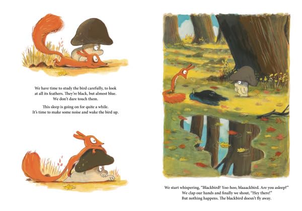 Squirrel and his best friend, Pock the mushroom, sit on the old stump, watching birds fly by. When they’re tired of this, they take the path to the yellow meadow to listen to the blackbird sing. But today, the bird’s not there. The friends look everywhere. Finally they find it on the path, all stretched out and quite still. It must be sleeping. They sit down quietly and wait for the bird to wake.