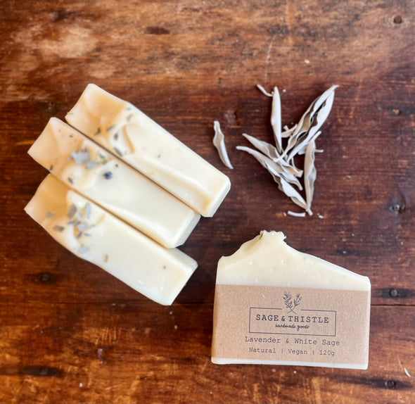 Featuring organic Lavender flowers & cleansing White Sage grown in the Sage & Thistle organic urban garden, pure earthy and floral essential oils, a blend of nourishing, organic and Fair Trade plant oils and butters for a deep and gentle cleanse that won't strip or dry out your skin, and white Kaolin clay for some gentle detox, this bar is balanced & gentle enough for everyday use as a hand, face and body wash.