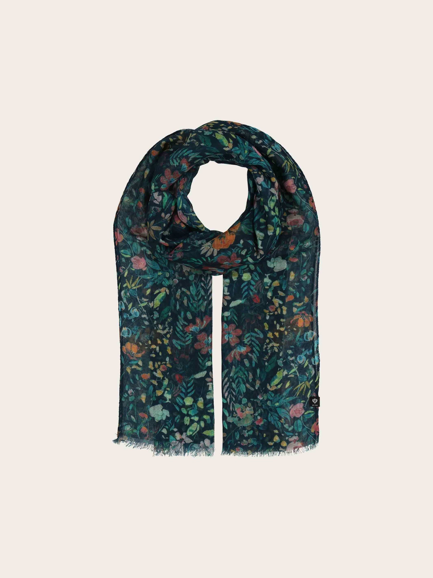 This scarf is printed with countless colourful flowers. Thanks to the many colours used, it can be combined with many outfits. The scarf was produced in a CO2-neutral way and is made from polyester obtained from used PET bottles. This recycled polyester saves up to 53% energy compared to conventional production and can itself be reused.