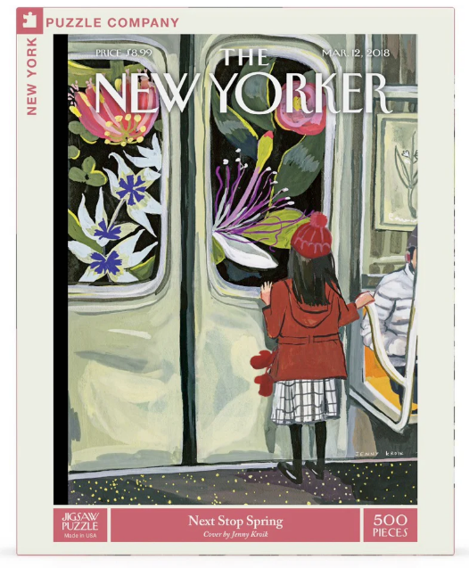 Celebrate the arrival of spring with vibrant imagination in Next Stop Spring, a 500 piece jigsaw puzzle featuring artwork by Jenny Kroik. This beautifully illustrated puzzle captures a quiet, magical moment as a young girl stands at the subway door, waiting to step out into a world blooming with oversized, whimsical flowers in brilliant colors.