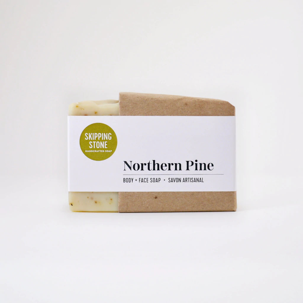 This bar is enriched with rice bran oil and nourishing shea butter, and dotted with finely crushed peppermint leaves. The Northern Pine bar is inspired by a cozy log cabin, and smells like pine trees, cedar, ginger and clove. Suitable for all skin types.