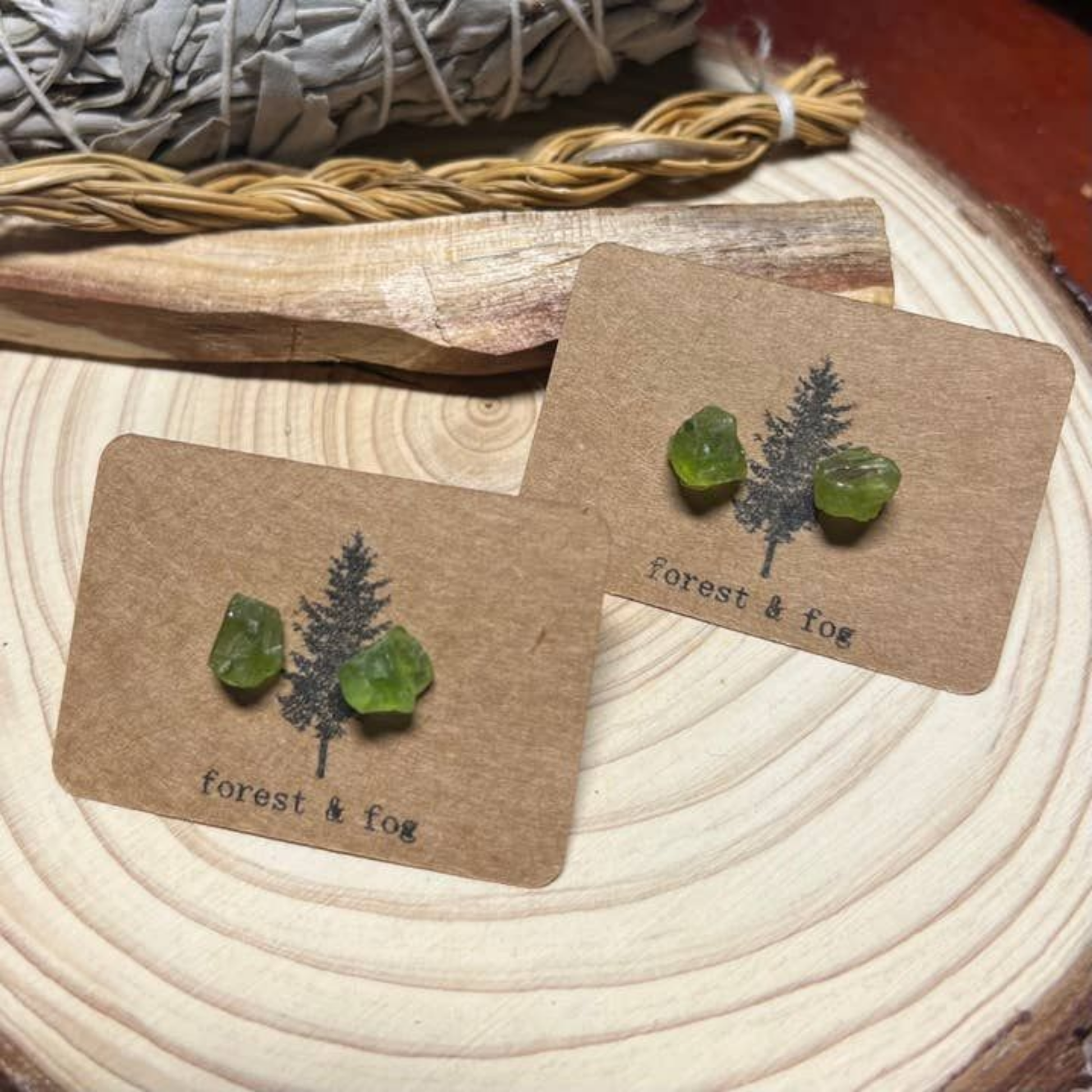 Raw Peridot studs on hypoallergenic sterling silver posts. Each stud is unique and hand matched to it’s perfectly imperfect pair.