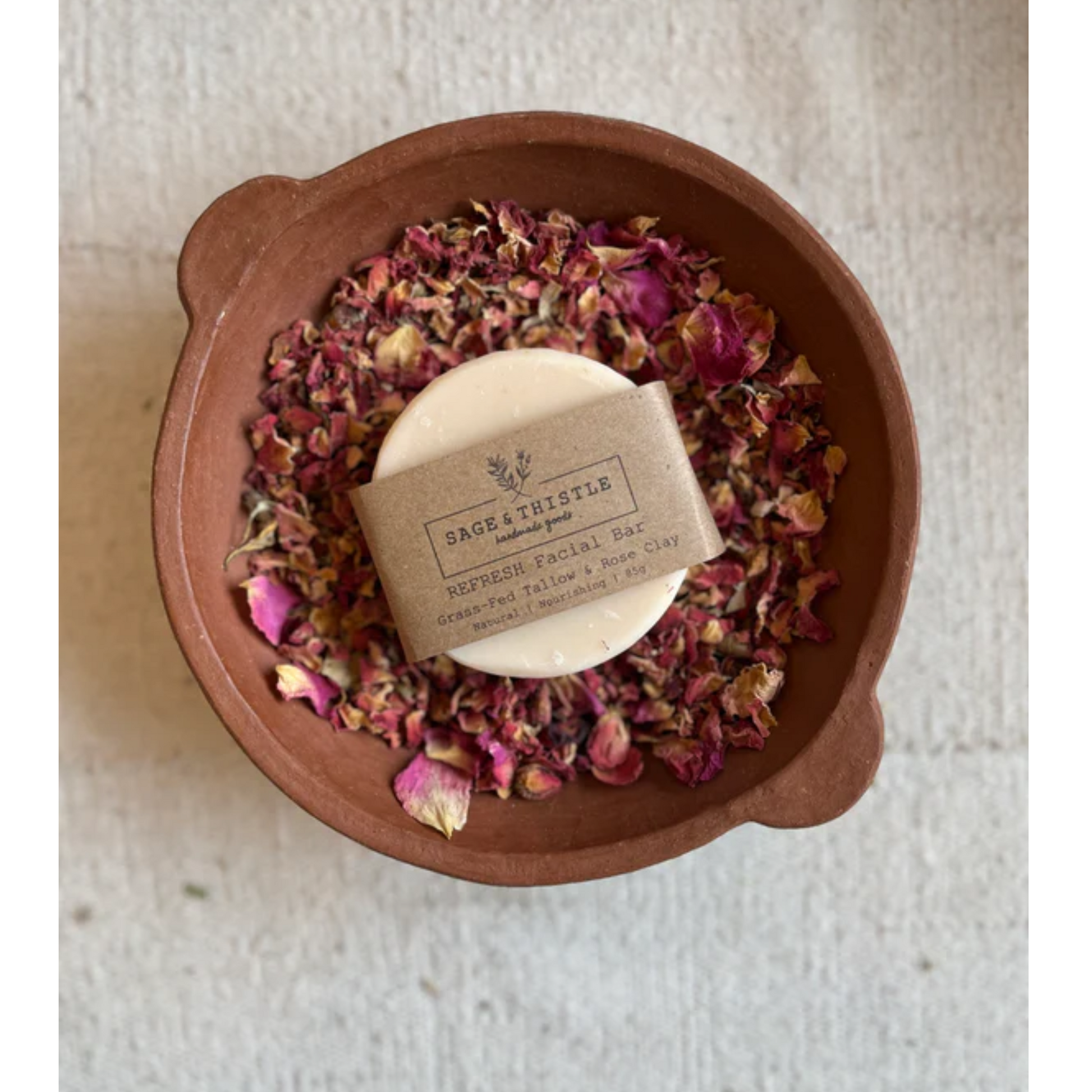 A facial in a bar of soap, this all-natural and small-batch made creation is packed with nourishing ingredients to pamper your skin. A nourishing blend of hand-rendered Ontario grass-fed tallow & pasture-raised lard alongside organic plant oils including Jojoba cleanse and hydrate skin, while white, purple and rose clays gently pull toxins from pores. Organic vitamin-rich Rose Hips, Hibiscus and Rose petals nurture skin, leaving it bright and refreshed! Subtly scented with a blend of anti-microbial essential oils including Tea Tree, Lavender, Geranium, and Copaiba Balsam. All-natural, biodegradable, and suitable for everyday use as a face, hand, and body bar.