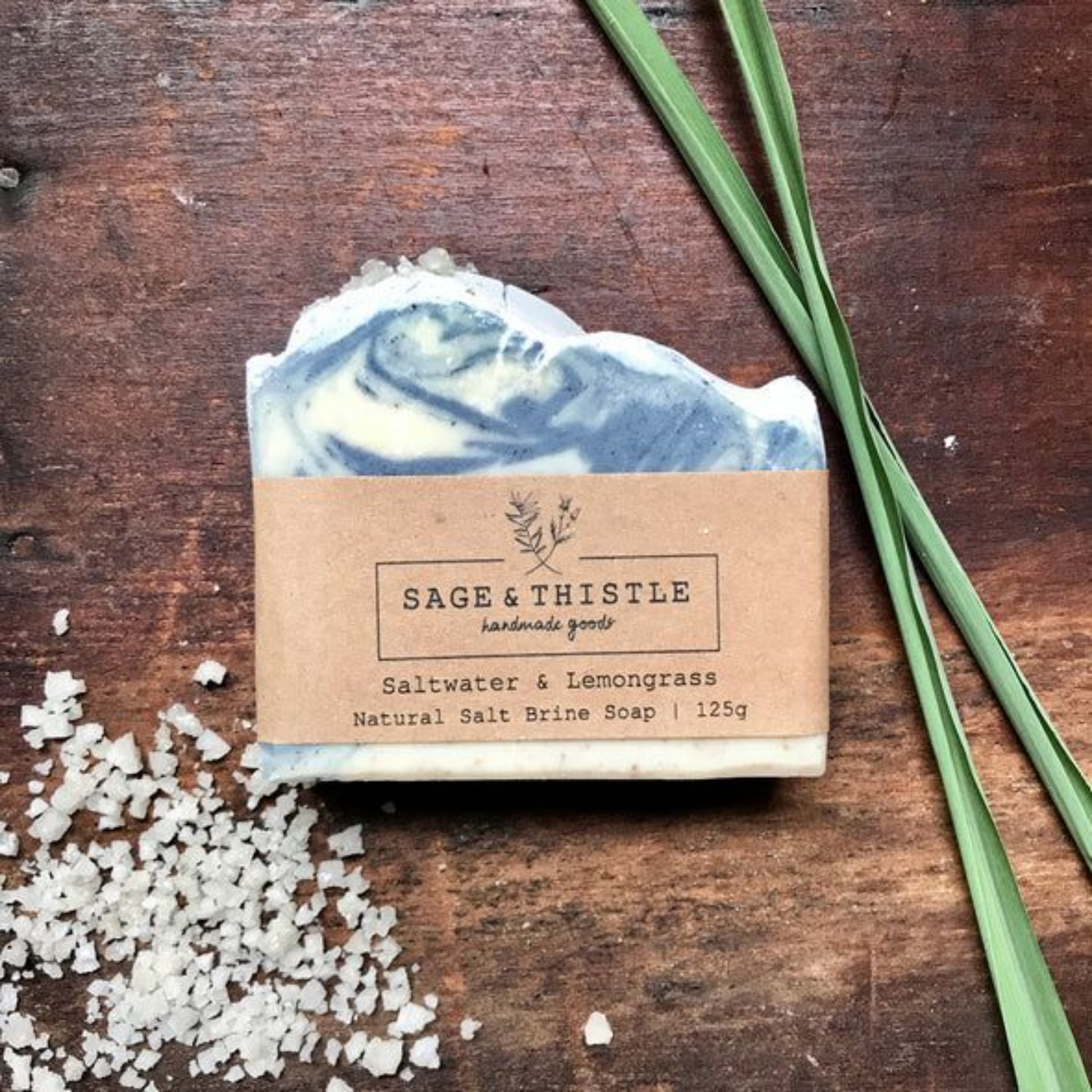 This 100% natural, vegan soap is handcrafted using a Canadian Sea Sea Salt brine, helping to bring moisture to your skin while providing a naturally detoxifying & non-drying cleanse! Scented with bright Lemongrass & citrus oils, and crafted with quality, organic and Fair Trade plant oils and butters, this artisanal soap is naturally colored with Indigo & topped with organic Lemongrass from the Sage & Thistle Garden, and Canadian sea salt from Newfoundland. Added Apricot kernel meal provides gentle exfoliation. This Sage & Thistle favorite is perfect for everyday use on hands, face & body!