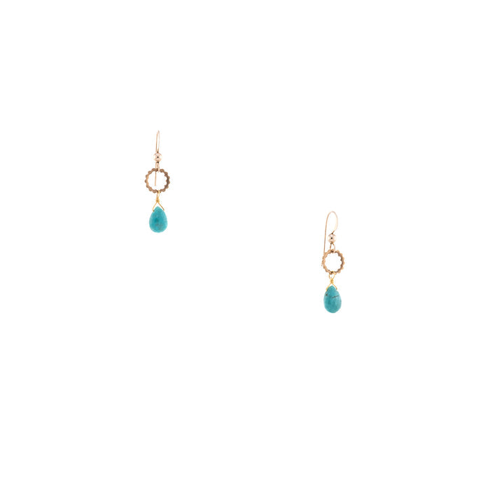 The Sidra Earrings feature hand-cut gemstones, recycled vintage brass textured rings, and 14K gold-fill earwires. Available in Turquoise, Peridot & Rhodochrosite. The Sidra Earrings are the perfect complement to your favourite HG necklace if you’re looking for a matching set.