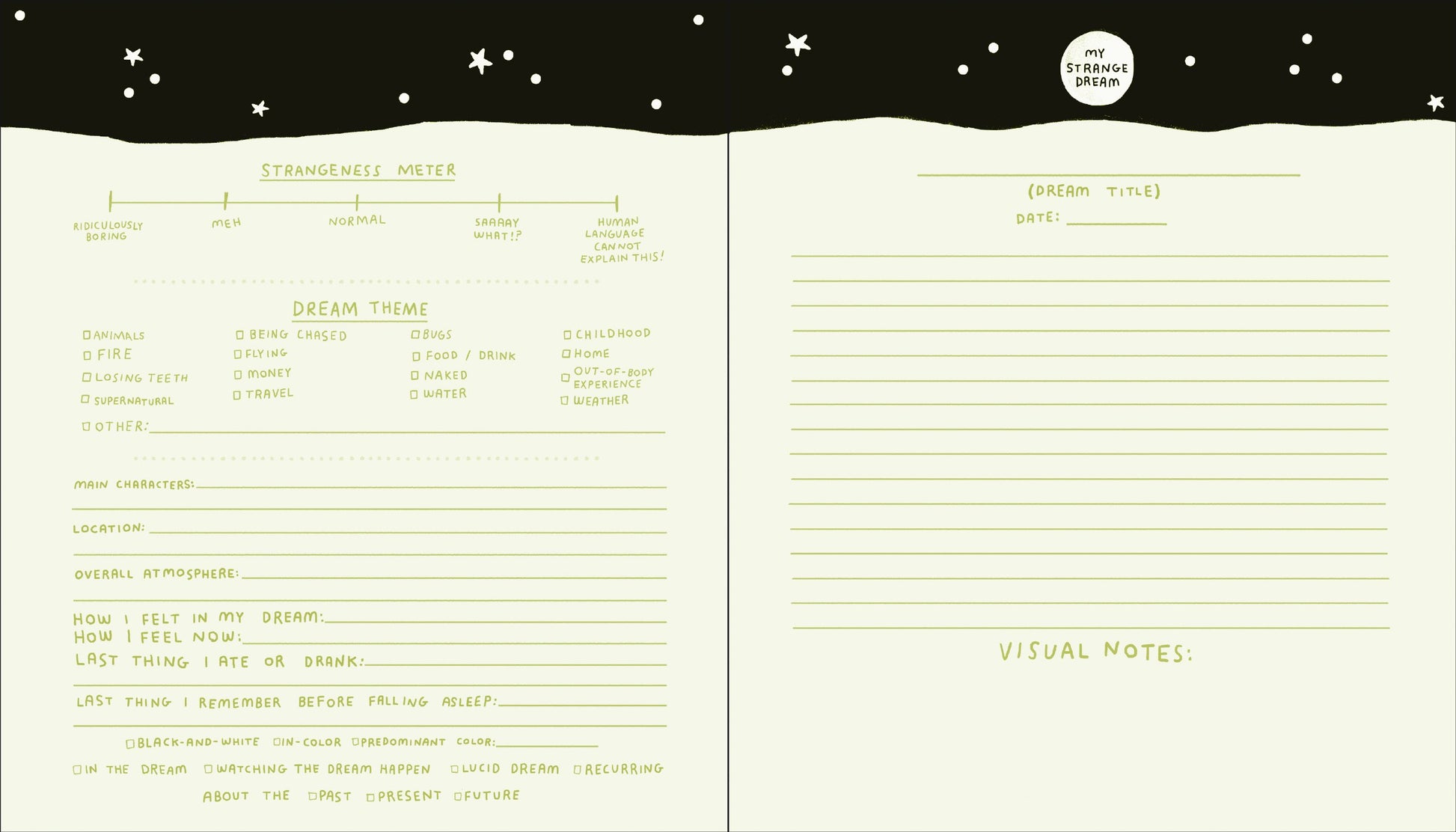 People dream an average of two hours every night. In a lifetime, that can be years of dreaming! With plenty of space to write and draw, guided prompts and checkboxes to help dream recall, and fun facts sprinkled throughout, Strange Dreams invites users to take the time to appreciate the fascinating and elusive world of dreams.