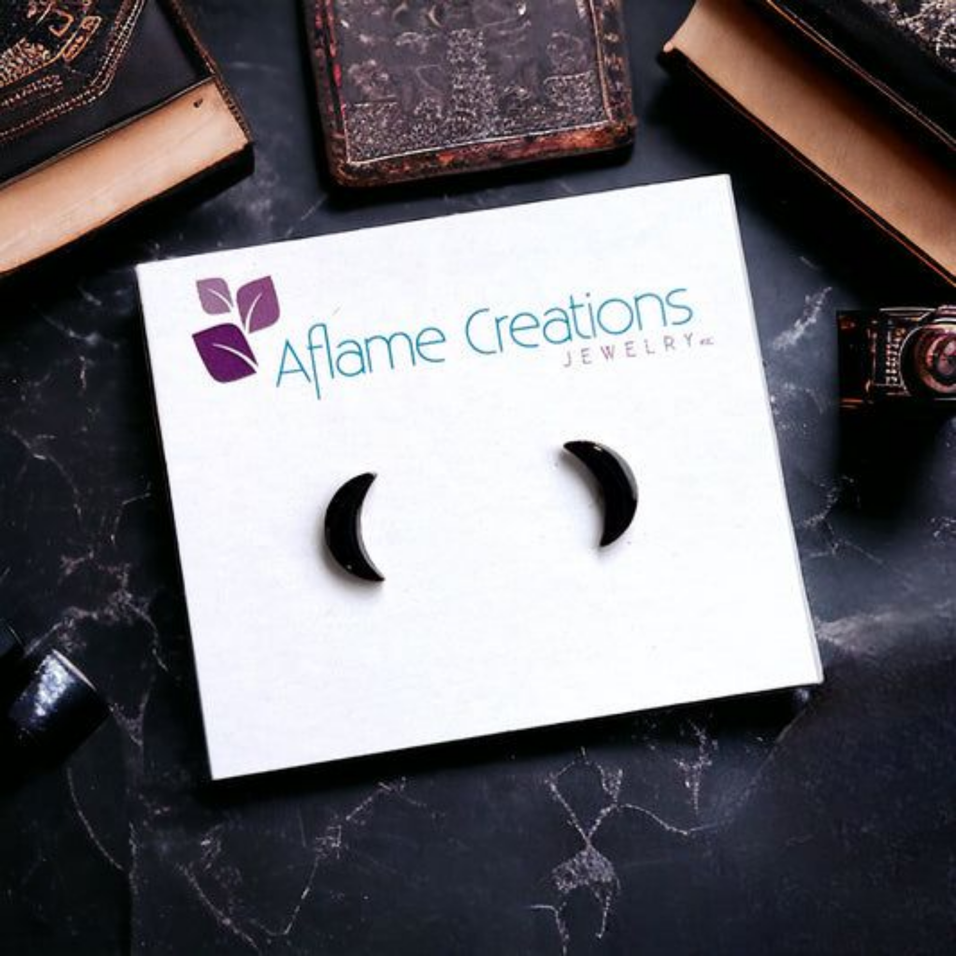 These enameled copper moon stud earrings are 9mm tall and are mounted on stainless steel posts and backings.