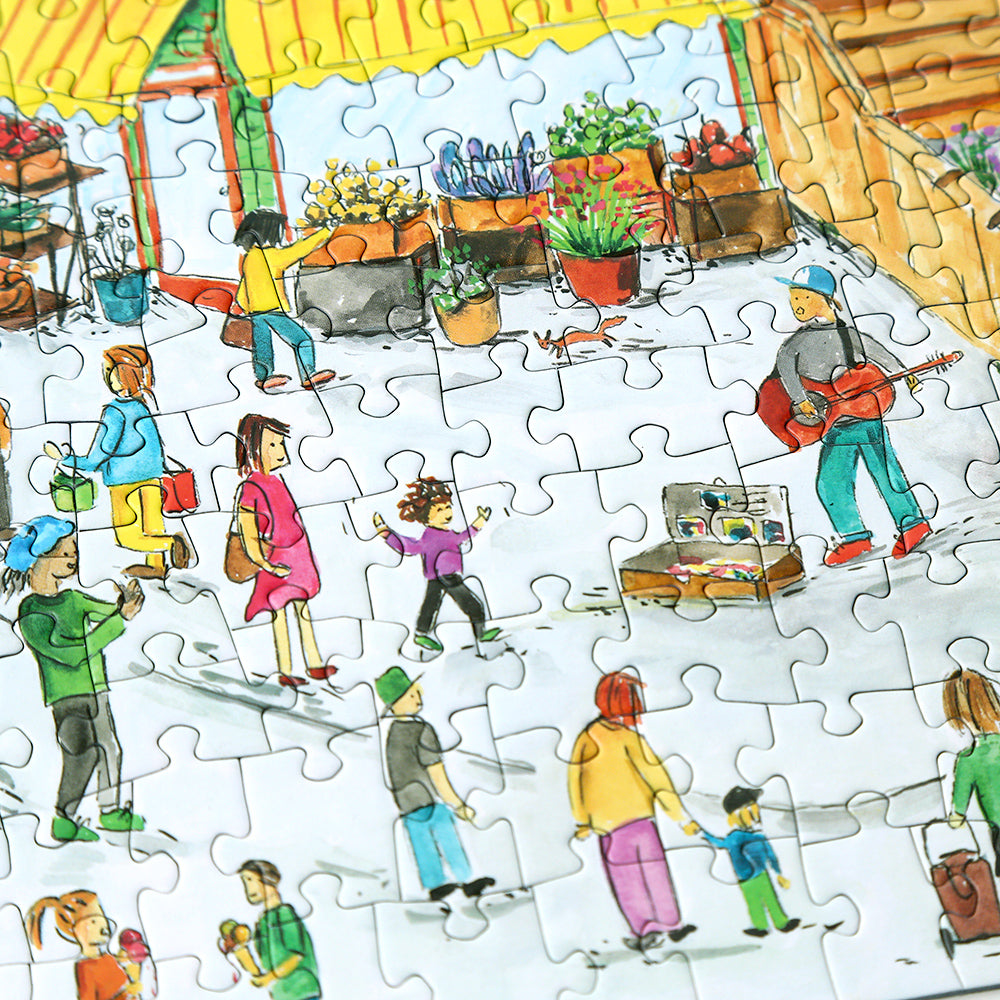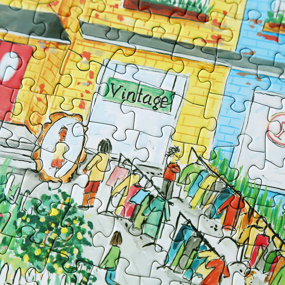 Toronto's Kensington Market is bustling in this 1000-piece puzzle, a celebration of life in the big city! Enjoy building this vibrant scene, full of nods to Toronto life like the Blue Jays, the Raptors, the iconic streetcar, Chinatown, raccoons and landmarks like Grossman's Tavern, the CN Tower and the SkyDome.