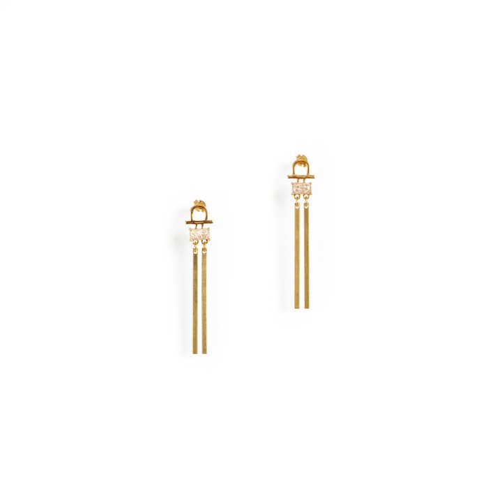 With clean lines and a lightweight profile, the Volute Earrings are a great mid-sized earring option. Hand-cut gemstones are set in 14K gold-plated brass with Vermeil studs and recycled brass dangling sticks.