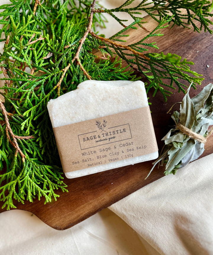 Earthy, grounding, and calming properties abound in our popular White Sage & Cedar soap. This bar is infused with organic botanicals from the Sage & Thistle Garden, gentle Cambrian clay, and sea kelp & salt from Canada's East coast, with natural exfoliation when used directly on the skin, and a creamy, gentle & hydrating lather when lathered separately on one of our Organic Cotton Shower Poufs or other natural fiber cloth. This soap is 100% natural & biodegradable, vegan, and suitable for use as an everyday hand & body soap.