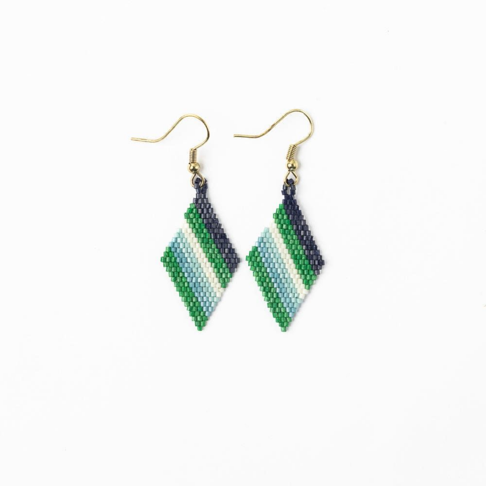 Gorgeous colourful beaded earring in a diamond shape, measures 1" long. Diagonal stripes of alternating colour are very eye catching.
