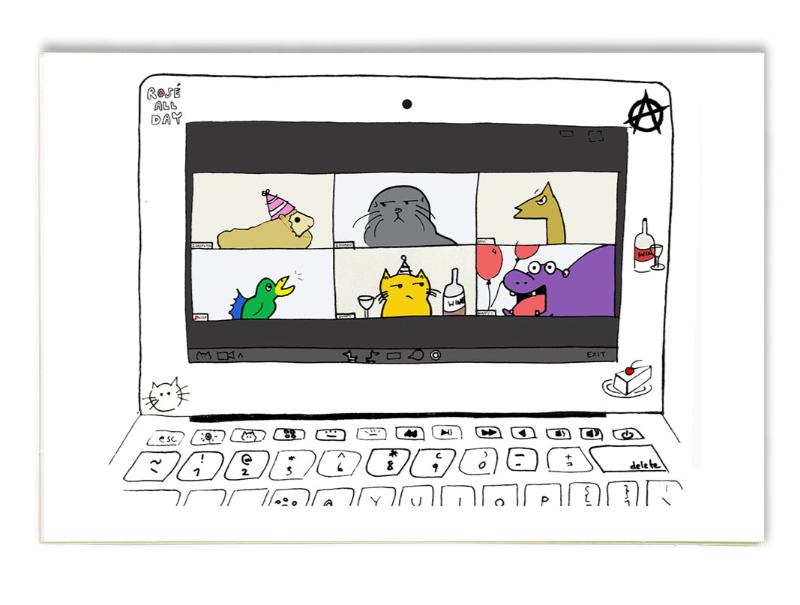 this is how we party now! get your Zoom party hat on and join these guys for another fun adventure. Resentment Cat's got her wine going and Happy Hippo has decorated with balloons. and Evil Llama is still evil.